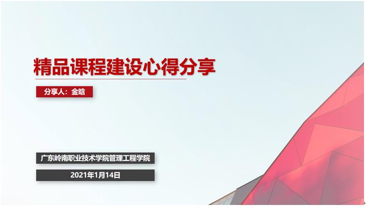 为全面提高教师教学能力和课程建设水平,打造精品课程,促进教学内涵发展,提升教师综合素质、专业化水平和创新能力全面提升,助力人才培养目标的实现。管理工程学院于2021年1月14日下午14:00举行“2021年精品课程建设培训会”。本次培训邀请了农工商职业技术学院省级精品课程建设负责人金晗老师为我院教师进行了精品课程建设的培训。本次培训采用线上线下的形式进行,管理工程学院执行院长翟树芹老师、副院长许宝利老师、全体专业主任以及全体教师共同参加了此次分享会。