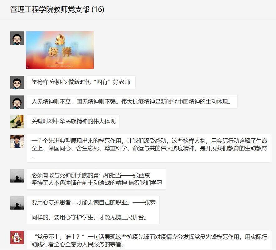 由中组部和中央台联合制作的《榜样5》专题节目于2021年3月22日晚8点在央视综合频道(CCTV-1)档如期首播,管理工程学院教师党支部在翟树芹书记的带领下,同全体党员通知共同学习收看了本次节目。观看学习过程中,积极开展交流研讨,翟树芹书记要广大党员要学习榜样事迹,积极参加“学习身边榜样”活动,争做担当作为的好榜样。我们要“不忘初心、牢记使命、勇于斗争、敢于抗疫、勇冲先锋,一位位前线党员用行动诠释了人民至上、生命至上,全心全意为人民服务的宗旨。” 翟树芹书记在线上论坛中如此提到。