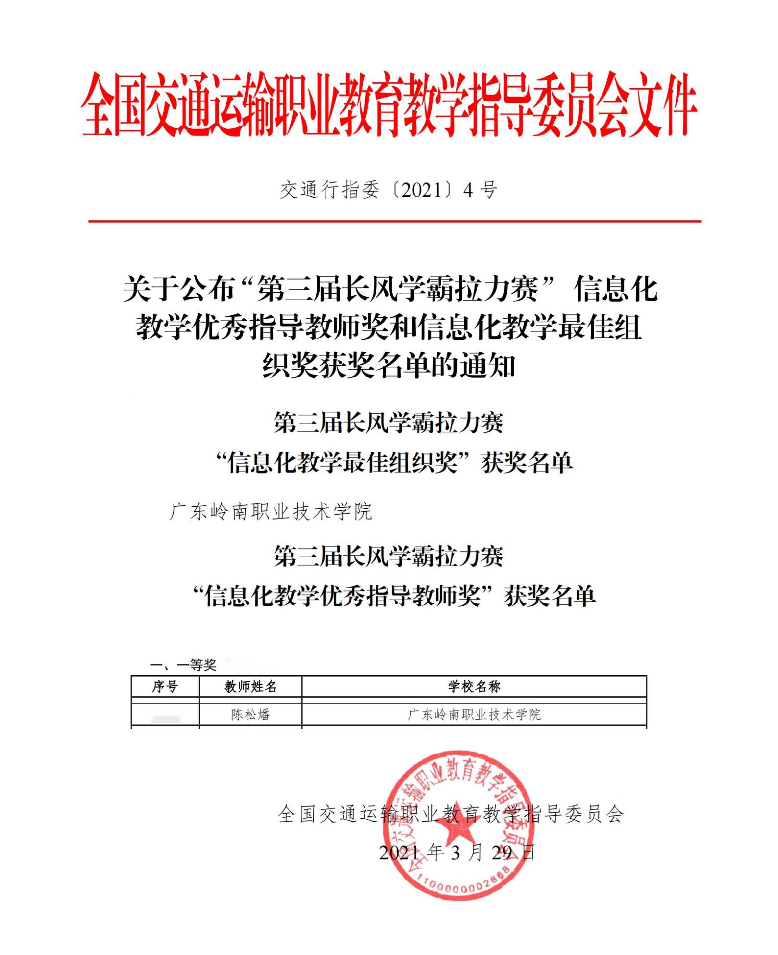 陈松燔老师荣获本次大赛“信息化教学优秀指导教师奖”一等奖