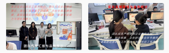 为期一周的实训圆满落幕,各团队依次进行成果汇报,展示公司文化、业务流程、经营数据、单据凭证、宣传物料及实训心得,全面呈现实训的丰硕成果。