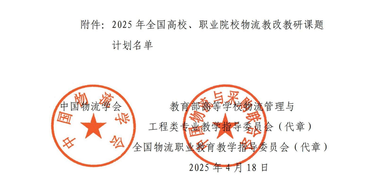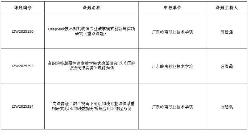4月18日,根据中国物流学会、教育部高等学校物流管理与工程类专业教学指导委员会、全国物流职业教育教学指导委员会共同下发的《关于下达2025年全国高校、职业院校物流教改教研课题立项计划及相关工作安排的通知》,广东岭南职业技术学院国际经贸学院现代物流管理专业由陈松燔副教授主持的《DeepSeek 技术赋能物流专业教学模式创新与实践研究(JZW2025120)》(重点课题),汪春霞副教授主持的《高职院校颠覆性课堂教学模式改革研究-以《国际货运代理实务》课程为例(JZW2025293)》,刘碧枫老师主持的《“岗课赛证”融合视角下高职物流专业课体系重构研究-以《物流数据分析与应用》课程为例(JZW2025294)》3项教改教研课题获立项。
