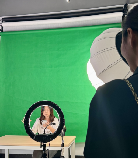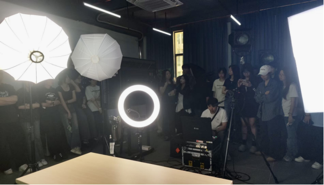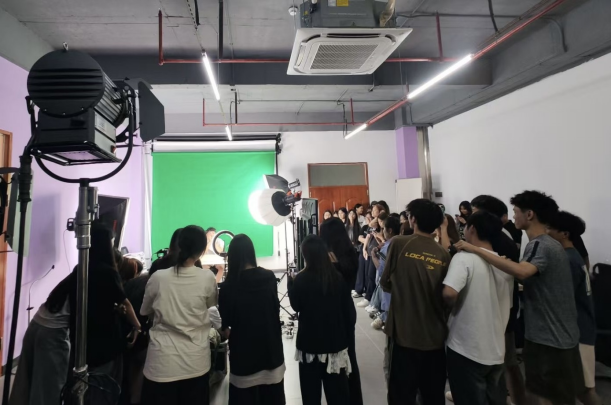 在分享会之后,同学们跟随直播导师进入融媒体直播室进行实战操练。经过课堂分享和指导之后,同学们跃跃欲试,纷纷登场出境,从一开始的紧张不安到侃侃而说,逐步展现出良好的专业素养和团队合作能力。资深主播培训总监刘晓琳老师高兴地说,“传播与策划专业同学们的主动学习能力和精神风貌非常棒!”