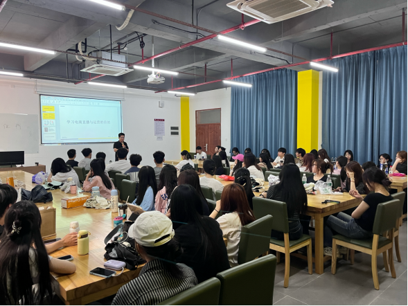 “现在做直播正当时!”在分享会上,梁峻玮总经理首先为同学们介绍直播行业趋势和新疆文旅直播项目背景。粱老师表示,直播已经渗透到电商销售、品牌推广等广泛领域,从带货变现到品牌孵化,每个赛道都蕴含造富机遇。"这个行业不难进,普通人也能快速上手,但要想长期发展,得会做优质内容、懂经营粉丝、会看数据反馈,这三样缺一不可。"
