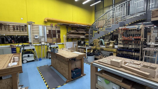 步入木艺车间,看到标准化的真实工作环境,从标准工作台、到材料样板、木艺工具等,一应俱全。学生在这里不仅能画图,更能亲手将图纸变为精致的实体作品,做到产学研创一体化。