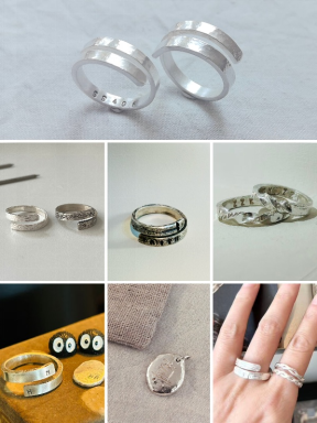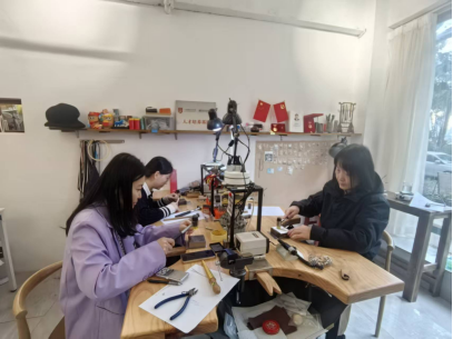 继2025年11月双方就课程融合达成合作意向后,此次金属錾刻体验成为首项落地的教师实践活动。在工作室专业工艺师的指导下,教师们从认识工具、学习基础錾刻技法入手,亲手在银料上进行图案绘制、錾形敲击与表面处理,完成了从图案到实物的创作过程。原本见于服饰的纹样,通过锤与錾的节奏,转化为戒指、银牌等金属饰品上的灵动印记,让教师们直观感受到传统工艺在不同材质上的转化与应用。