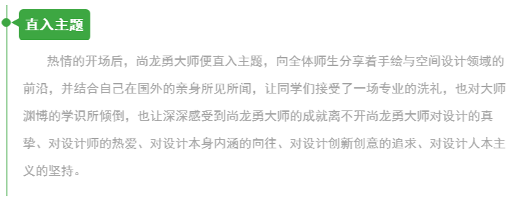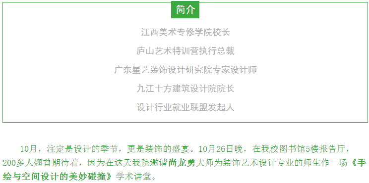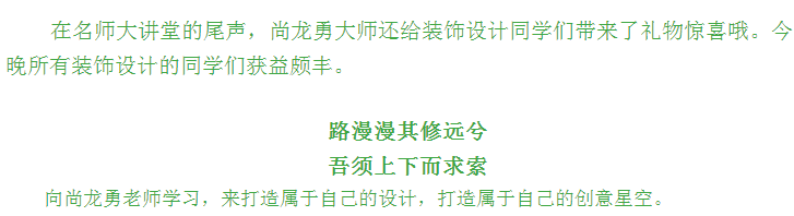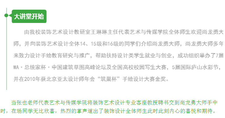 名师大讲堂 -尚龙勇大师“手绘与空间设计的美妙碰撞”学术讲堂 来源: 发布时间:2021-04-19 10:40:12 浏览次数: 次 【字体:小 大】 名师大讲堂 -尚龙勇大师“手绘与空间设计的美妙碰撞”学术讲堂 终审:胡林林 分享到: 【打印正文】