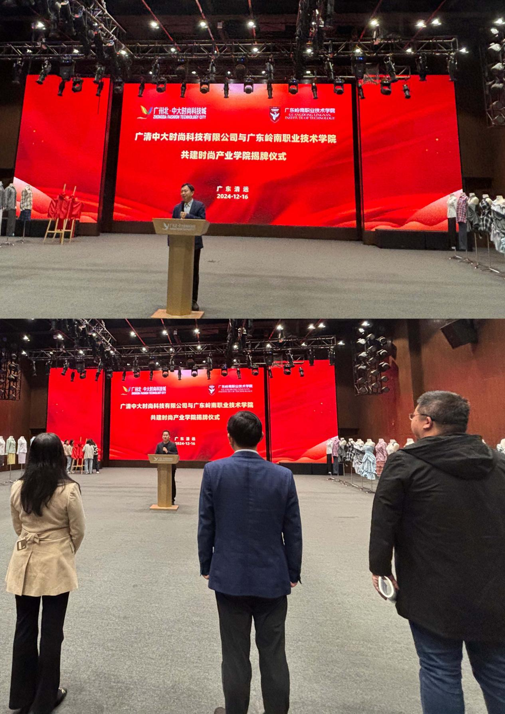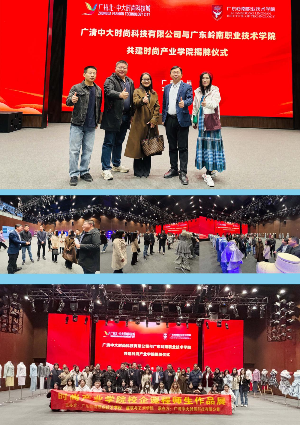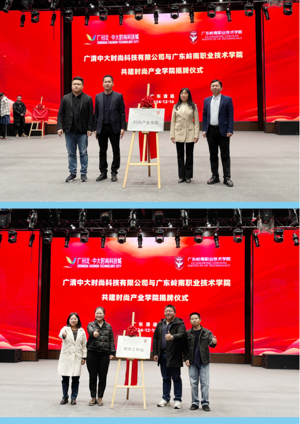 2024年12月16日,广东岭南职业技术学院与广清中大时尚科技有限公司共建时尚产业学院揭牌暨校企课程师生作品展在广州北·中大时尚科技城演播厅顺利举行。