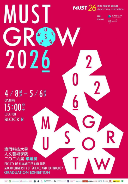 MUST GROW 2026届毕业展」展期为48日至56日(每日9:00-18:00,含周末及公众假期),地点位于澳科大R座综艺厅、R座六楼美术馆及三楼公共空间。展期内设导赏及对接讲解环节。