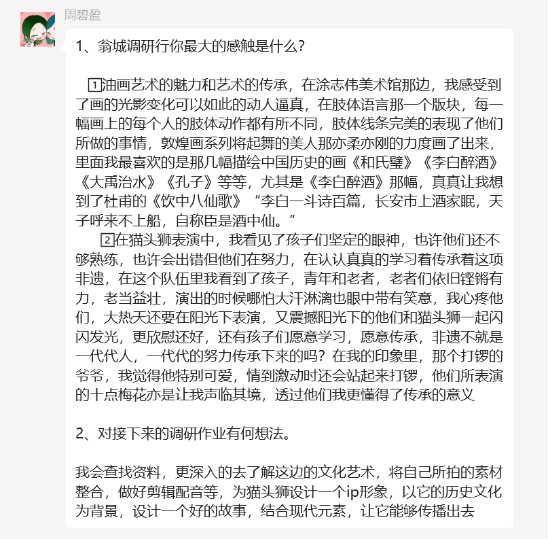 此次翁城非遗文化展开延伸课题学习,有助于引导广大青年学生把课堂学习和乡村实践紧密结合,设计出符合社会价值和市场价值的翁城猫头狮IP形象及衍生文创。坚持从实际出发,积极抢抓机遇,立足当地发展基础和资源禀赋,以全新的艺术创作形式,整合高校院所专业资源优势,助力传统非遗技艺破圈出圈、助力传统文化品牌赋新能;以实际行动深入实施“百千万工程”、切实推动我省文旅、合作共建,将优秀的教学成果书写在城乡区域协调发展新画卷上。