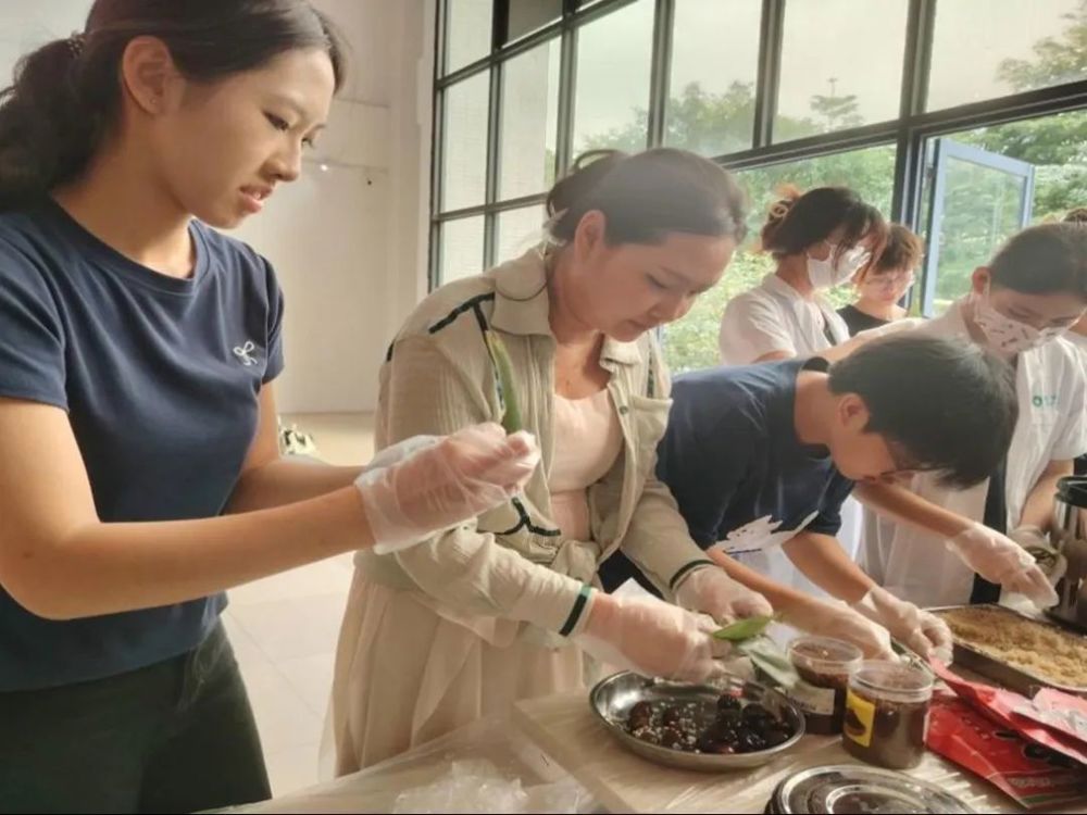 活动当天,工作人员精心准备了糯米、粽叶、蜜枣等丰富的食材。在活动现场,工作人员热情地向大家讲解了粽子的制作方法和技巧,老师与学生们一起动手,开始制作粽子。他们各展身手,相互学习取经。叠“漏斗”、放糯米、加配料、压实、折粽叶、绑紧,每一步都充满了技巧与乐趣。在大家的共同努力下,一个个形状各异、有棱有角的粽子应运而生,仿佛承载着大家对节日的祝福和喜悦。活动现场充满了欢声笑语,洋溢着浓烈的节日氛围,让大家深刻感受到了传统文化的魅力和温暖。