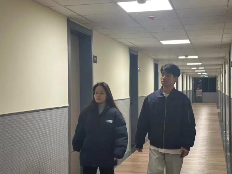 夜间巡查人员及预备党员们在巡查过程中,仔细检查了明德11号楼的各个楼层、走廊、楼梯间以及公共设施。他们重点关注宿舍内的安全隐患和公共区域的卫生状况,确保环境整洁有序。整个巡查过程严谨有序,充分展现了明德书院对学生安全的高度重视和负责态度。
