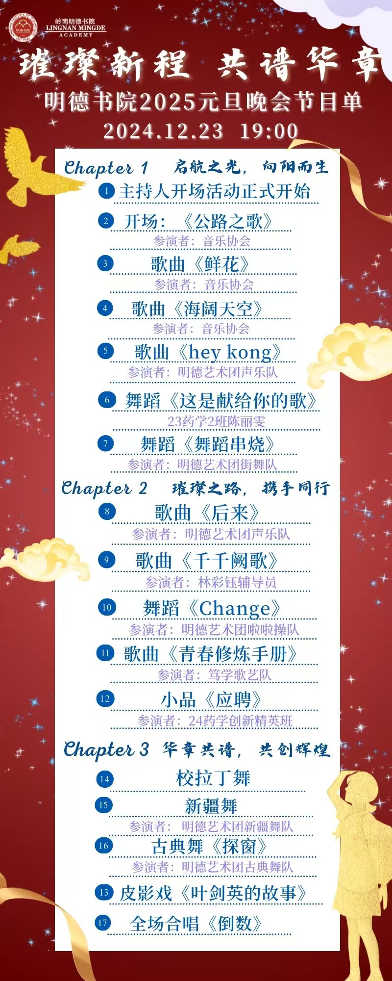 时光荏苒,如白驹过隙,我们即将告别过去的一年,迎来充满希望与挑战的新一年。元旦作为新的开始,承载着人们对未来的美好憧憬。为了丰富校园文化生活,展现明德书院学子的青春风采,增强师生之间的凝聚力,营造欢乐祥和的节日氛围,特此举办此次元旦晚会。