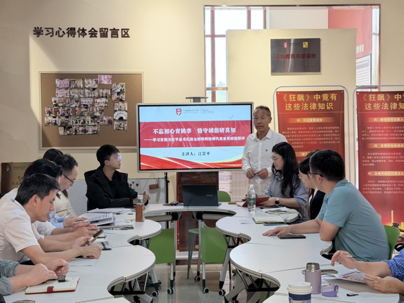 江景平教授以《不忘初心育桃李 恪守诚信研真知——学习贯彻习近平总书记给全国特岗教师代表重要回信精神》为题,带领全体教师深入学习习近平总书记给全国特岗教师代表的回信精神。他围绕提升教师育人本领、规范学术行为等核心问题展开深入解读,并结合典型学术不端案例进行警示教育,引导教师严守学术底线、恪守职业操守。