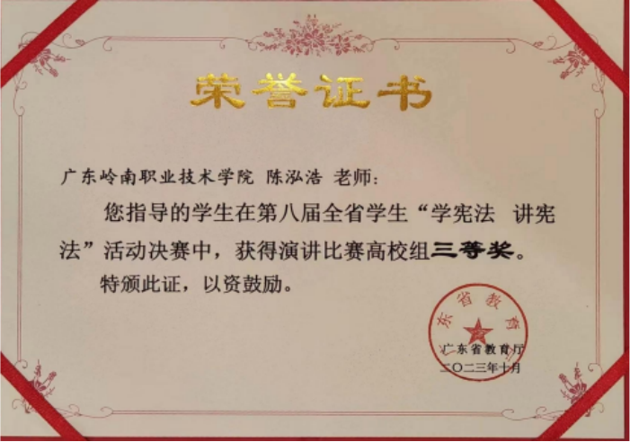 一路育人,一路载誉。奋斗在职业教育的沃土上,陈泓浩老师以学生为中心深研教学做有温度的教育,并指导学生在比赛中获奖:指导学生获2023年广东省民办高校红色经典主题诵读展演决赛专科组一等奖,指导学生在2023年清远法治文化高校行模拟法庭PK赛中获二等奖,指导学生获广东省教育厅2023年广东省全省学生“学宪法 讲宪法”演讲竞赛三等奖,指导学生获广东岭南职业技术学院第十四届“挑战杯”广东大学生创业计划竞赛优秀奖。