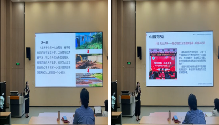 杨娟老师在《共建 共治 共享——构建社会治理新格局》课堂上以情景小剧场演绎作为课程导入,通过理论讲授、互动答题、小组探究活动、学生展示如“百千万工程”线上VR展览、案例分析等方式,让教学“强”了起来,课堂“活”了起来,学生“动”了起来。