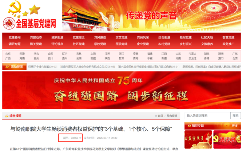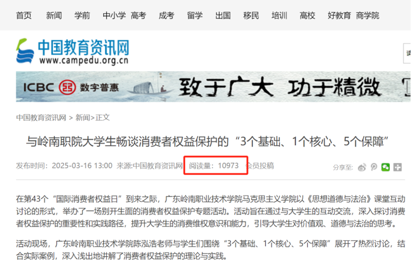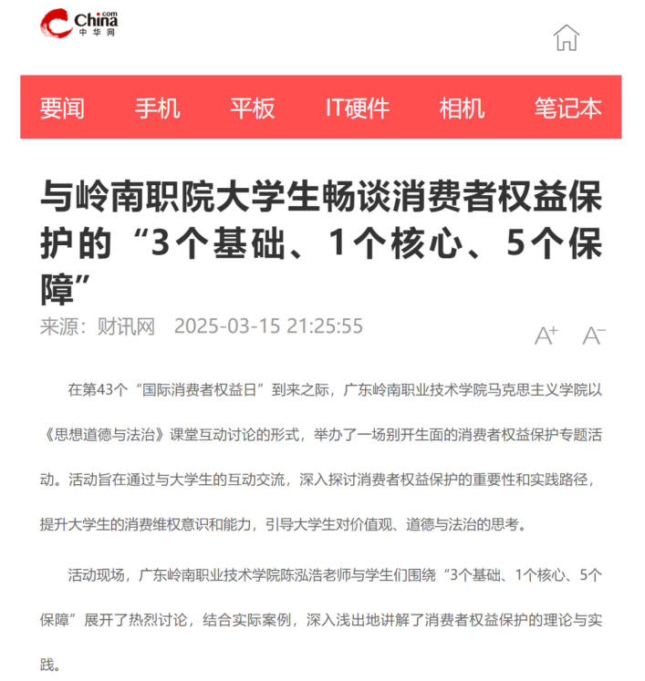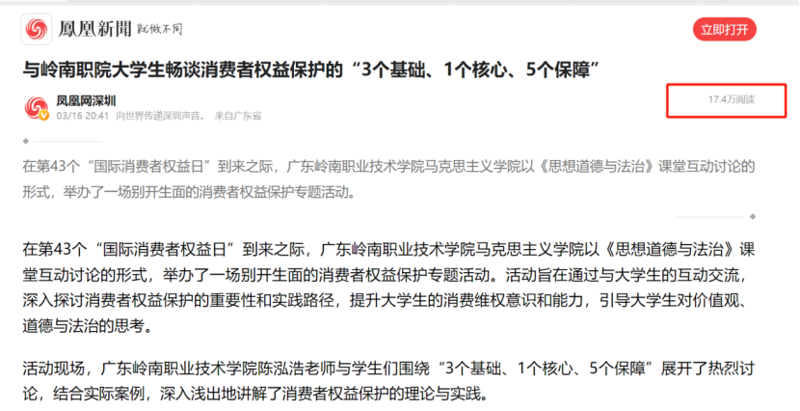 陈泓浩老师将此次教学活动成果撰写成新闻稿《与岭南职院大学生畅谈消费者权益保护的“3个基础、1个核心、5个保障”》,并发布于多个知名平台。包括:“全国基层党建网”、“中国教育资讯网”、“凤凰新闻”、“搜狐”客户端以及“中华网”,累计阅读量已突破26万。此次教学改革成果的广泛传播,是我校马克思主义学院在教育教学领域的创新实践,也是高校思想政治教育的有益尝试。学校将继续深化教学改革,积极探索创新教学模式,不断提升教育教学质量,为培养德智体美劳全面发展的社会主义建设者和接班人贡献力量。