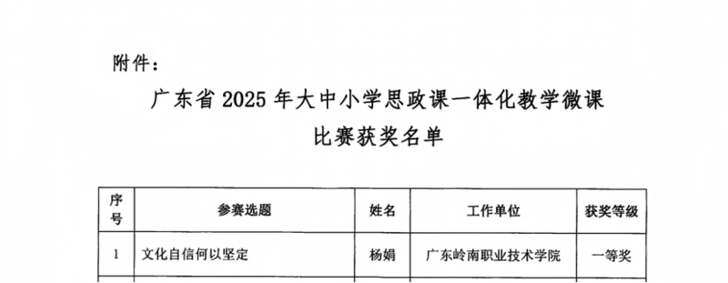 2025年7月9日,广东省职业学校思政课协组、广东省大中小学思政课一体化共同体(广轻大)、广东省高校思政课区域协同创新中心(广轻大)公布广东省大中小学思政课一体化教学微课比赛获奖名单,我校马克思主义学院教师杨娟以作品《文化自信何以坚定》荣获一等奖。