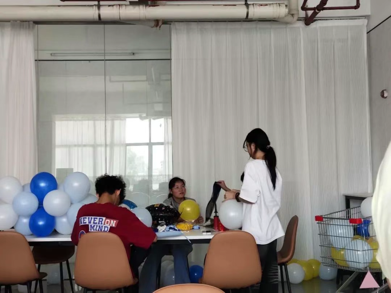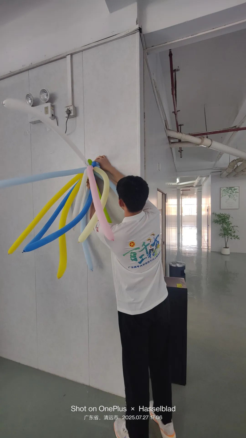 当第一缕阳光洒进社区活动室,这里便化身成充满魔力的“造梦工坊”。队员们分工协作,化身巧手的“空间魔法师”。五彩的气球被吹起、扎结成朵朵“云彩”与可爱的造型,轻盈地飘向天花板;彩带如同绚丽的虹桥,串联起每一个角落的喜悦;桌椅被仔细擦拭、有序排列,等待着承载明日求知的小小身影。每一个装饰的细节,每一处空间的布置,都倾注着护航队员们对“小候鸟”们最温柔的欢迎:“这里,将是你们快乐学习、勇敢探索的第一个温暖驿站!”那份藏在气球里的惊喜,正是为和岭南童伴护航队为初次相遇埋下的快乐伏笔。