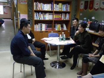 | ◢思政部于洪霜老师在认真的阅览义工团的相关资料。 | ◢思政部石丽媛主任一行与义工团肖国兵(左三)部长、伍军秘书长(左二)等合影。 |