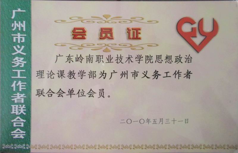 经广州市义务工作者联合会严格审核,并报相关上级部门批准,学院思政部于2010年5月31日正式成为广州市义务工作者联合会单位会员。6月7日,伍军秘书长代表广州市义务工作者联合会为思政部颁发了“广州市义务工作者联合会单位会员证”。