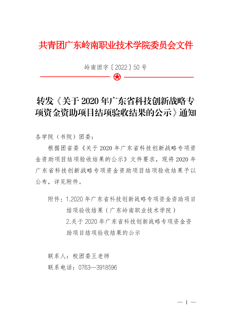 岭南团字〔2022〕50号 关于转发2020年广东省科技创新战略专项资金资助项目结项验收结果的通知 来源: 发布时间:2023-01-17 10:25:50 浏览次数: 次 【字体:小 大】 终审:团委 分享到: 【打印正文】
