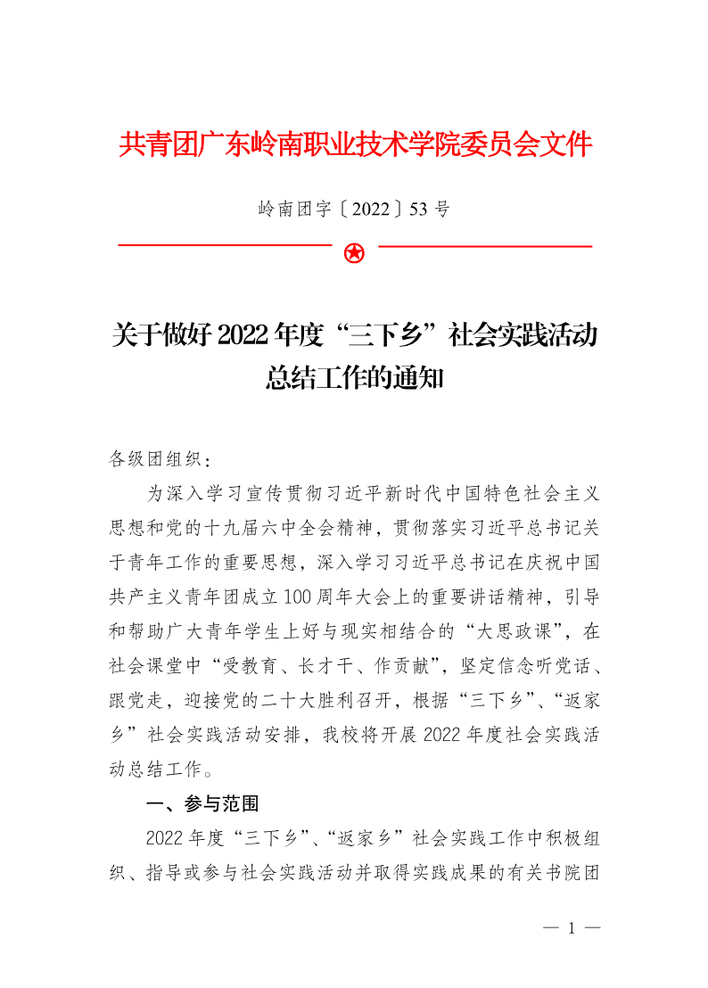 岭南团字〔2022〕53号 关于做好2022年度“三下乡”社会实践活动总结工作的通知 来源: 发布时间:2023-01-17 10:32:08 浏览次数: 次 【字体:小 大】 附件1-10.rar 终审:团委 分享到: 【打印正文】