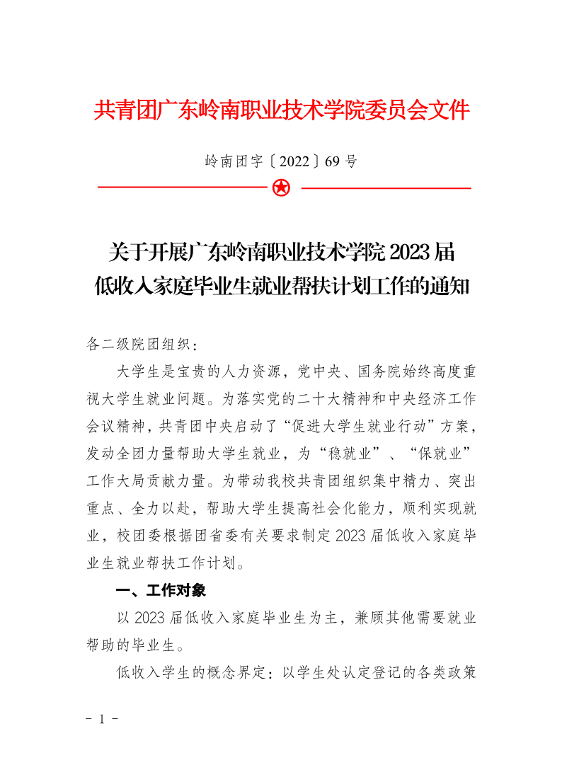 岭南团字〔2022〕69号 关于开展广东岭南职业技术学院2023届低收入家庭毕业生就业帮扶计划工作的通知 来源: 发布时间:2023-01-17 10:54:34 浏览次数: 次 【字体:小 大】 附件1帮扶学生就业意向信息采集表.docx附件2“团团微就业”精准结对帮扶小程序团干部操作手册.pdf 终审:团委 分享到: 【打印正文】