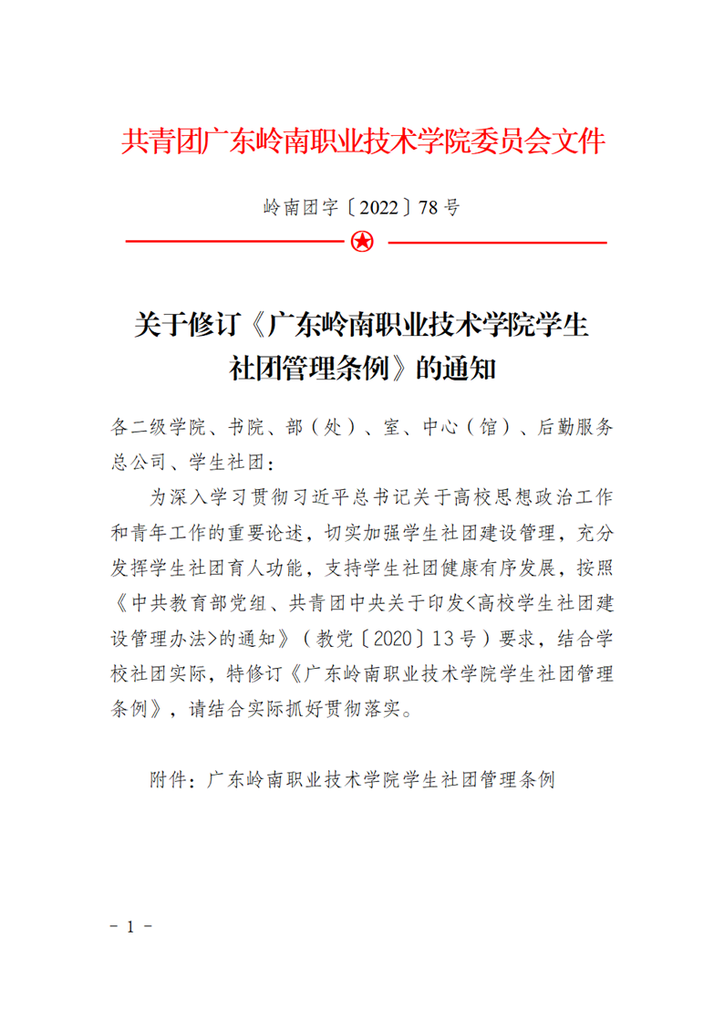 岭南团字〔2022〕78号关于修订《广东岭南职业技术学院学生社团管理条例》的通知 来源: 发布时间:2023-01-17 10:59:44 浏览次数: 次 【字体:小 大】 附件广东岭南职业技术学院学生社团管理条例.docx 终审:团委 分享到: 【打印正文】