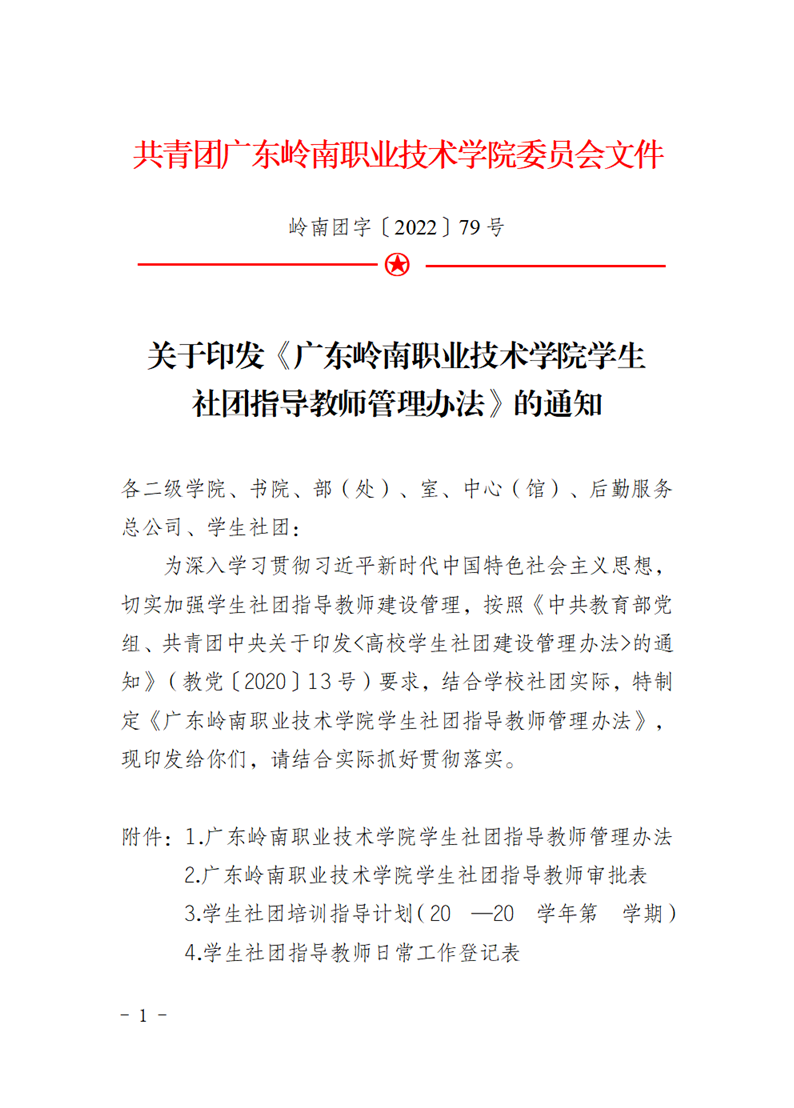 岭南团字〔2022〕79号 关于印发《广东岭南职业技术学院学生社团指导教师管理办法》的通知 来源: 发布时间:2023-01-17 11:00:13 浏览次数: 次 【字体:小 大】 附件2广东岭南职业技术学院学生社团指导教师审批表.docx附件3学生社团培训指导计划(20—20学年第学期).docx附件5学生社团指导教师学期考核登记表.docx附件6学生社团指导教师工作考核评分表.docx附件1广东岭南职业技术学院学生社团指导教师管理办法.pdf附件4学生社团指导教师日常工作登记表.docx 终审:团委 分享到: 【打印正文】