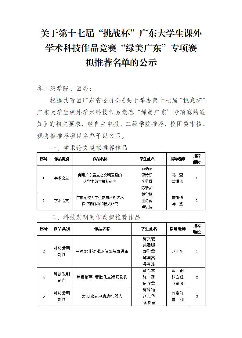 关于第十七届“挑战杯”广东大学生课外学术科技作品竞赛“绿美广东”专项赛拟推荐名单公示 来源: 发布时间:2023-06-29 11:00:20 浏览次数: 次 【字体:小 大】 终审:团委 分享到: 【打印正文】