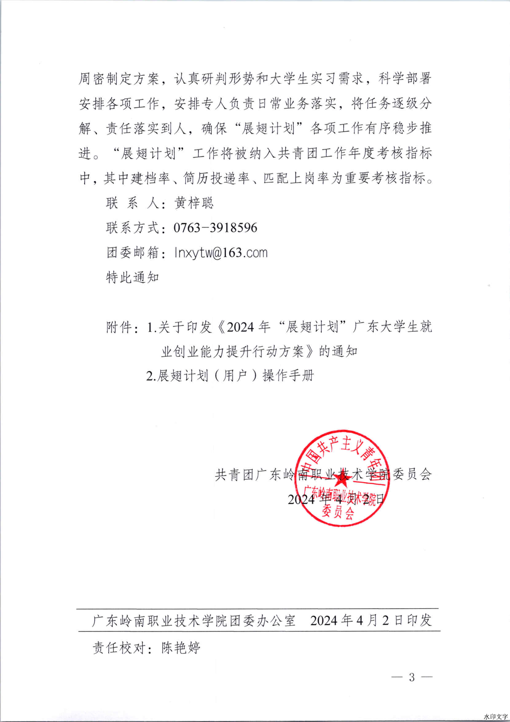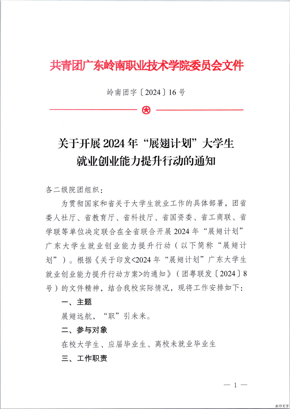 岭南团字〔2024〕16号 关于开展2024年“展翅计划”大学生就业创业能力提升行动的通知 来源: 发布时间:2024-04-03 14:44:28 浏览次数: 次 【字体:小 大】 202404031445476164.pdf202404031445482929.docx 终审:团委 分享到: 【打印正文】