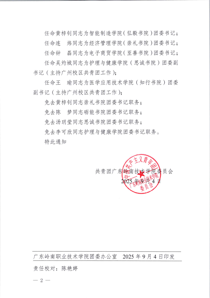 关于各二级学院(书院)团委书记任免的通知