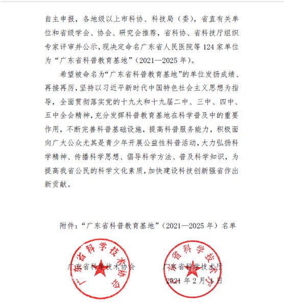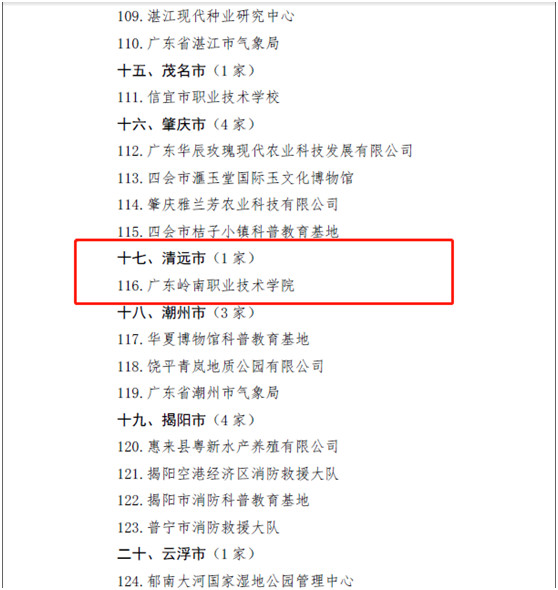 近日,广东省科学技术协会、广东省科学技术厅联合发文《关于命名广东省人民医院等124家单位为“广东省科普教育基地”的通知》,公布了2021年广东省科普教育基地名单,广东岭南职业技术学院是本次清远市获批的唯一一个省级科普教育基地。