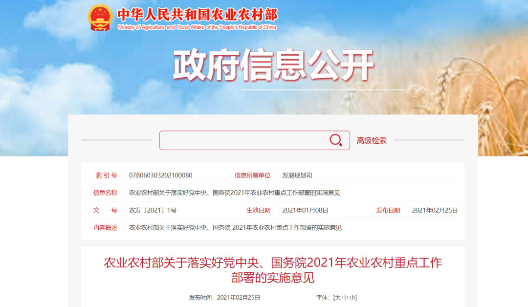 2021年是“十四五”开局之年,是建党100周年,做好农业农村工作具有特殊重要意义。各级农业农村部门要以习近平新时代中国特色社会主义思想为指导,全面贯彻党的十九大和十九届二中、三中、四中、五中全会精神,认真贯彻落实中央经济工作会议、中央农村工作会议精神和2021年中央一号文件部署,坚持稳中求进工作总基调,立足新发展阶段,贯彻新发展理念,构建新发展格局,坚持创新驱动发展,深化农业供给侧结构性改革,全力保障国家粮食安全和重要农产品有效供给,巩固拓展脱贫攻坚成果,全面推进乡村振兴,加快农业农村现代化,为全面建设社会主义现代化国家开好局、起好步提供有力支撑。