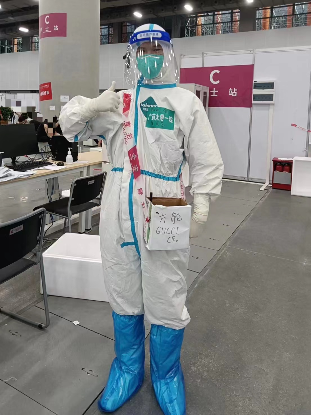 19级护理1班陈文艺带着母校的寄托于2022年6月踏向了他热爱的护理事业。2022年8月,陈文艺同学正式入职广东药科大学附属第一医院,成为急诊科的一员。进入科室的第一天,科主任和护士长就告诉他,急诊科是医院的第一道防线,应对突发公共卫生事件的第一站,救死扶伤的前沿阵地。这些话深深烙印在他的心中。今年11月广州迎来三年以来最严峻的考验和挑战,他得知医院需要支援琶洲方舱的时候,第一时间就报名了。别人问他:“你不害怕吗?”他说:“我作为一名预备党员,在人民需要我的时候必须站出来,逆行而上,冲在最前线。”当知道被选中成为首批支援琶洲方舱医疗队时,文艺同学心情无比的激动。但是由于疫情的原因,护士执业证书迟迟还没有拿到。眼见10号就要出发了,他心急火燎,8号、9号两天多次前往政务中心,请求工作人员加急给他盖章,他的执着深深地感动了工作人员,在符合工作规定的情况下,9号下午四点前终于拿到了执业证!踏上抗疫的征程。