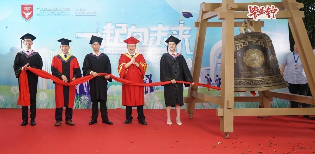 典礼最后,进入“敲响毕业钟”环节。校领导与毕业生代表上台共同敲响毕业钟,钟声的响起,预示着岭南学子顺利毕业,将以崭新的身份走向社会,开启人生新的征程。