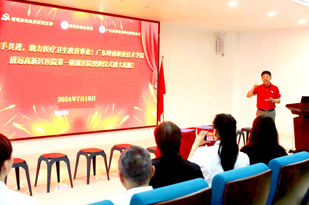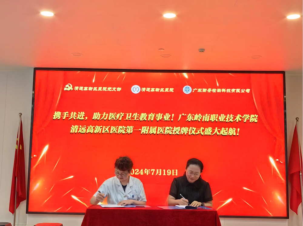 7月19日,广东岭南职业技术学院第一附属医院签约仪式暨授牌仪式在清远高新区医院举行。清远高新区医院副院长李俊、刘武,主任刘孟辉,院长助理张宇丽,我校党委书记柴克生,副校长翟树芹,校长助理、教务处(图书馆)处长辛增辉,医学应用技术学院执行院长叶桂荣、副院长周云等参加仪式。