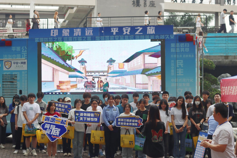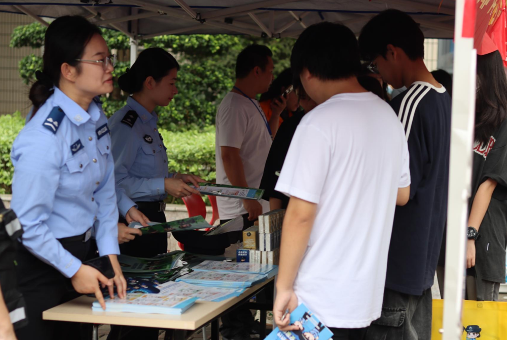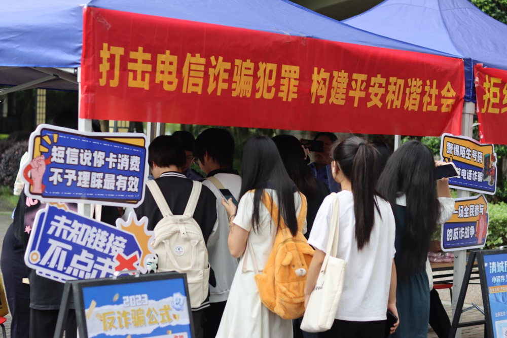 清远市公安局市局国保支队、清城区反诈中心、东城街道党工委和办事处的民警、工作人员将反诈宣传车开进校园,搭起电信反诈、反邪教警示教育、境外非政府组织境内活动管理法等宣传摊位,通过详细讲解安全法律法规、分享真实案例、分发宣传册及宣传礼品、打卡合作等形式,向我校师生普及法律法规和安全防范知识。我校师生积极参与,现场反响热烈。