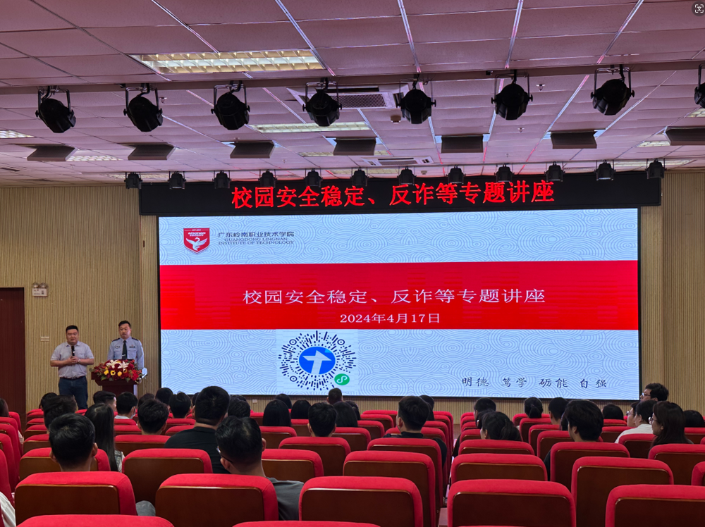 为进一步增强我校师生的安全防范意识,提高我校安全管理水平,切实做好校园安全管理工作,4月17日上午,清远市公安局国保支队、清城区反诈中心到我校清远校区图书馆报告厅为我校教职工开展校园安全稳定、反诈专题讲座。纪委书记李浩,学生处、 保卫处全体行政人员,各书院负责人和辅导员参加此次专题讲座,讲座由学校党委保卫工作部(处)副处长林炜主持。