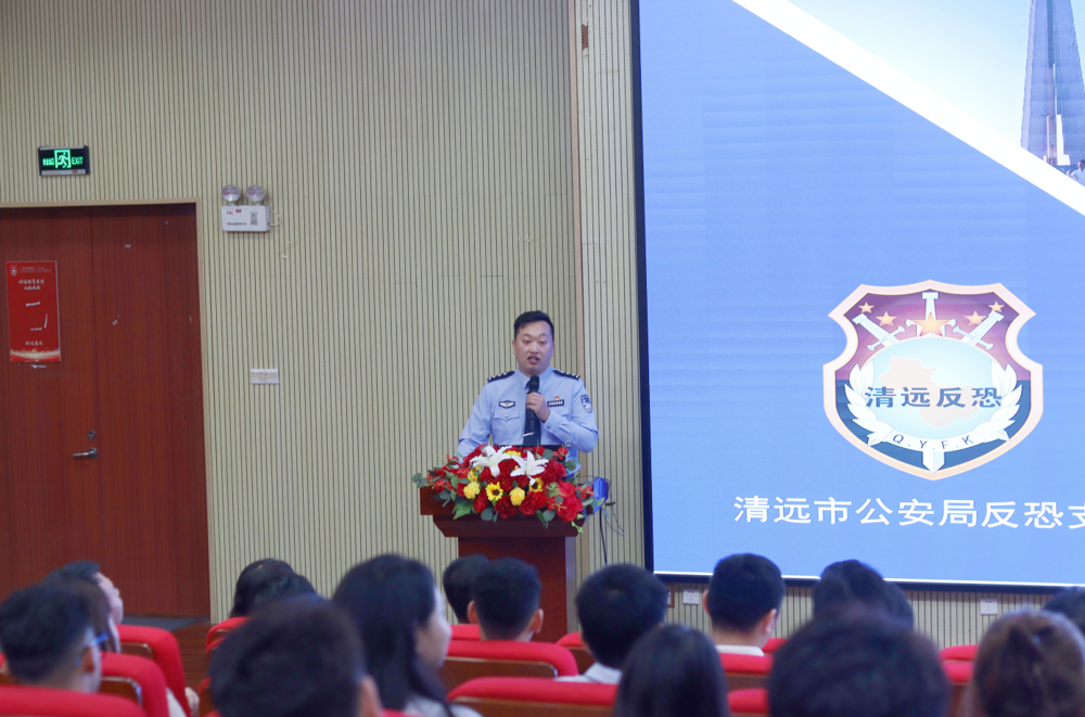 清远市公安局国保(反恐)支队二大队教导员、三级警长王帅以校园安全稳定为主题开展讲座。王帅警官结合网络案例和实际案例,用通俗易懂的语言为大家讲解有关维护校园安全稳定的知识和法律法规,并结合学校实际,为我校校园安全稳定工作提供建议和方法。他强调,学校安全管理人员应该时刻保持警惕,加强警校联动,遇到可疑现象要及时向警察反馈和寻求帮助。