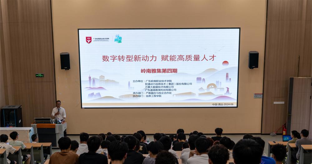 2024年6月25日,以“数字转型新动力,赋能高质量人才”为主题的广东岭南职业技术学院“岭南雅集”第四期在我校清远校区博雅楼举行。产教融合与校企合作处处长王胜强,信息工程学院院长佘学文等150余位师生及软通动力信息技术(集团)股份有限公司 、北京万算大数据技术有限公司、广东盈链教育科技有限公司的企业代表。活动由我校产教融合与校企合作处处长王胜强主持。