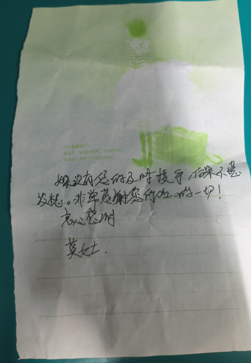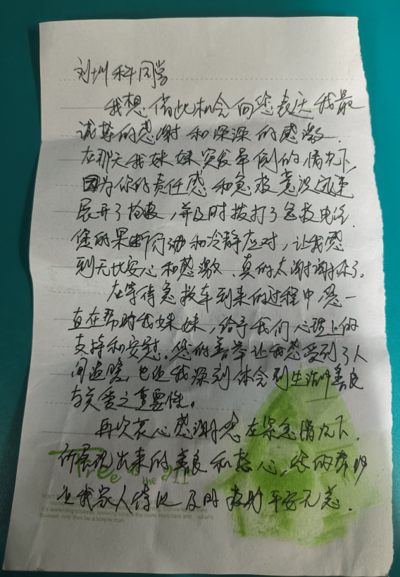 在等待急救车到来的过程,你一直帮助我妹妹给予我们心理上支持和安慰。您的善举让我感受到了人之间的温暖。也让我深刻体会到生活中的善良与关爱之间重要性。