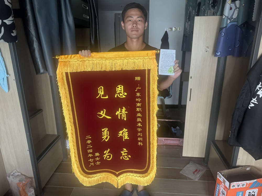 6月26日晚,在清远职教城职教一路金鸡岩附近,一女生身体突发不适,处于昏迷状态,情况十分危急。来自广东岭南职业技术学院崇礼书院23级工商企业管理专业刘圳科同学刚好看到这一幕紧急情况,立即对该女生进行紧急施救,并拨打120求助,直至医生赶到转送医院女生转危为安才放心离去。近日,女生家属为刘圳科同学送来感谢信与锦旗,大家才知道他静悄悄做了一件见义勇为的好事。