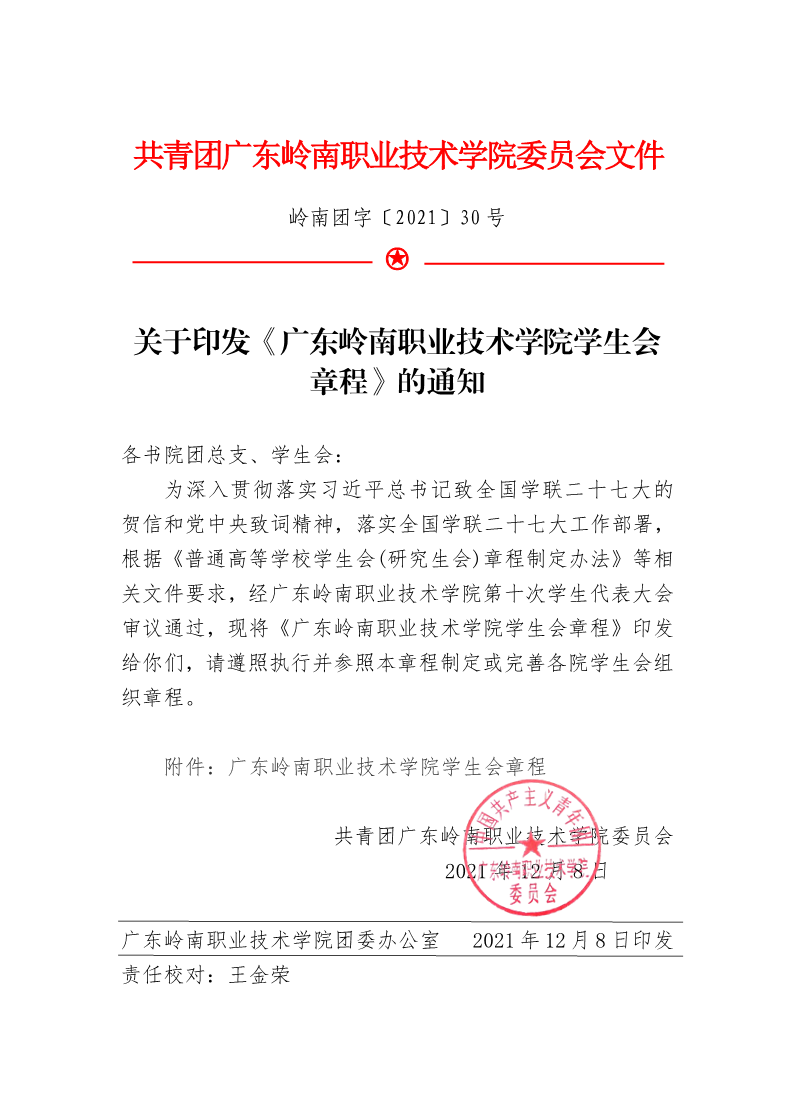 岭南团委[2021]30号 关于印发《广东岭南职业技术学院学生会章程》的通知