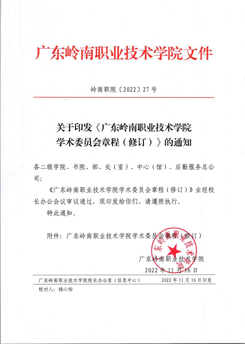 岭南职院[2022]27号 关于印发《广东岭南职业技术学院学术委员会章程(修订)》的通知 来源: 发布时间:2022-11-18 23:29:27 浏览次数: 次 【字体:小 大】 分享到: 【打印正文】