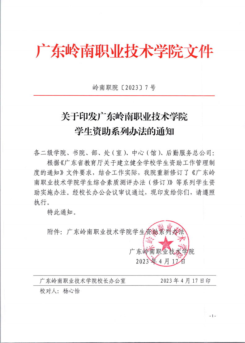 岭南职院[2023]7号 关于印发广东岭南职业技术学院学生资助系列办法的通知