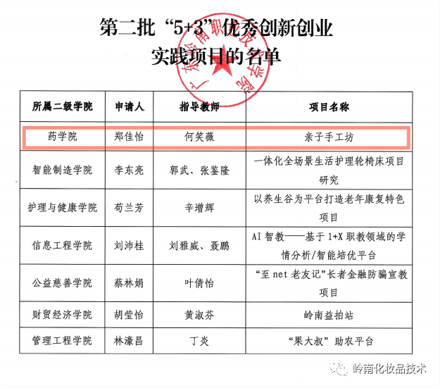 在2020-2021学年“5+3”优秀创新创业实践项目评选活动中,经过严格的内部筛选、就业处初审及校外专家的评审及公示。由药学院化妆品技术专业何笑薇老师指导的“亲子手工坊”创新创业项目,入选了第二批“5+3”优秀创新创业实践项目。