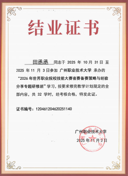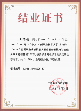 为深化“融产教,竞未来”主题党日活动成效,精准把握职业技能竞赛新趋势,2025年10月31日-11月3日,我院邓华明、田丞丞两位教师参加了广州职业技术大学主办的“2026年世界职业院校技能大赛省赛备赛策略与经验分享专题研修班”,以专业能力提升筑牢党建引领育人根基。
