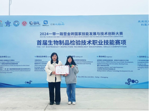 2024年11月29日至12月2日, 2024一带一路暨金砖国家技能发展与技术创新大赛首届生物制品检验技术赛项全国总决赛在重庆工贸职业技术学院举行,我院医学检验技术专业黄涵签老师指导的学生许小敏在众多选手中脱颖而出,荣获高职组三等奖。