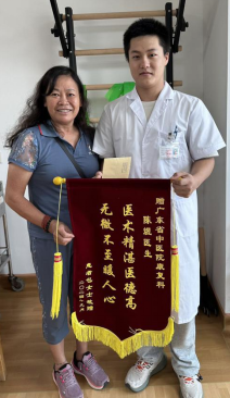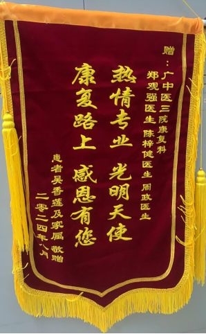 而在广东省中医院实习的陈煜同学说:“这面锦旗不仅是对我个人的肯定,更是对学校的老师们,以及医院的带教老师们的赞誉。它承载着病人的信任与感激,让我深刻明白自己的工作意义非凡。我会将这份荣誉转化为动力,不断精进技术。在未来的道路上,我将继续秉持初心,以更加饱满的热情和专业的态度,为更多病人开启康复之门,让他们能在病痛之后再次拥抱美好的生活。感谢广东省中医院这个广阔的平台,也感谢在这里遇到的每一位带教老师和同学。是他们的指导和鼓励,让我在面对各种复杂的康复情况时能够迅速成长。他们的专业精神和对患者的关爱时刻引导着我,让我明白了作为一名康复治疗师的真正意义。”